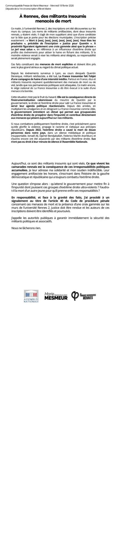 Communiqué de Marie Mesmeur, députée d'Ile et Vilaine suite aux menaces fascistes